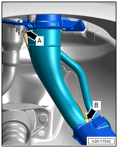 - The connector -arrow A- must be connected securely on the metal ring and the connector -arrow B- must be connected securely on the protective plate of the fuel filler neck.