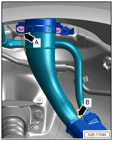 - The connector -arrow A- must be connected securely on the metal ring and the connector -arrow B- must be connected securely on the protective plate of the fuel filler neck.