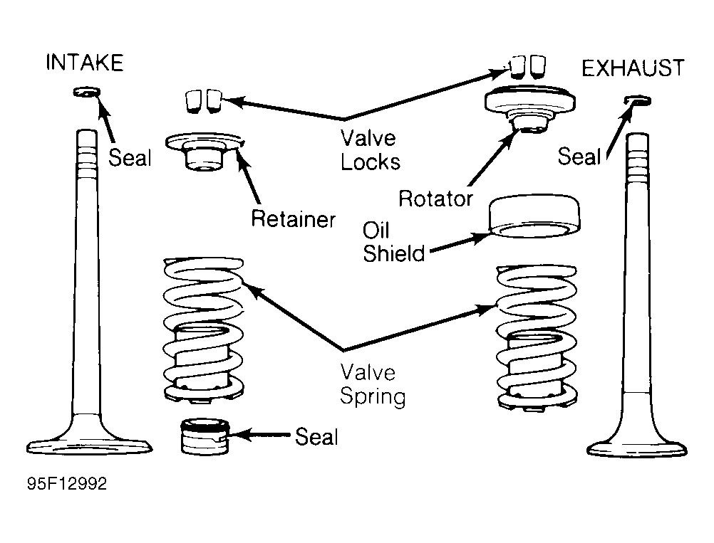 Mark valves for location. Using valve spring compressor, compress valve springs. Remove valve locks. Carefully release spring compressor. Remove retainer or rotator, valve spring, spring seat and valve. See Fig 1.