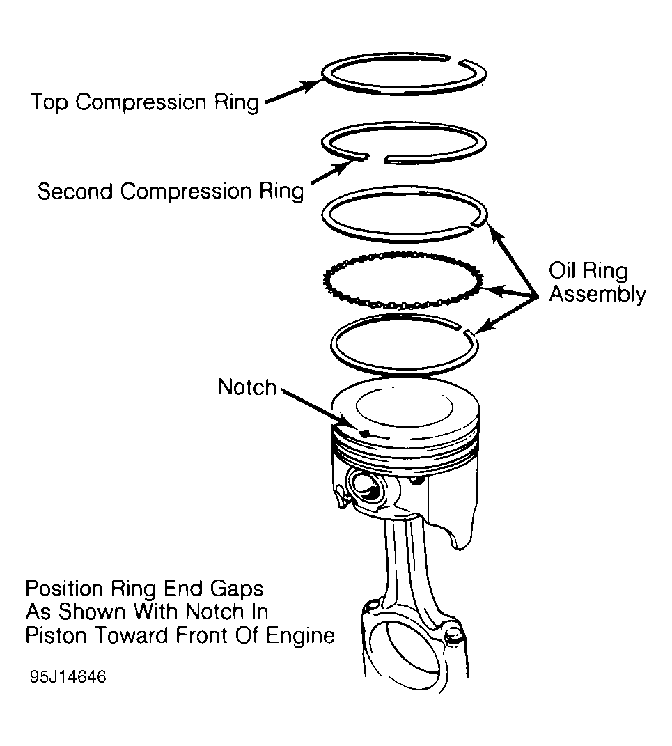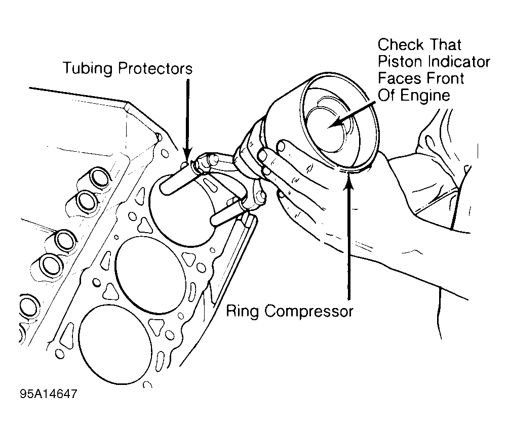 Install ring compressor. Use care not to rotate piston rings. Compress rings with ring compressor. Install plastic tubing protectors over connecting rod bolts. Install piston and connecting rod assembly. Ensure piston notch, arrow or FRONT mark is toward front of engine. See Fig 2.