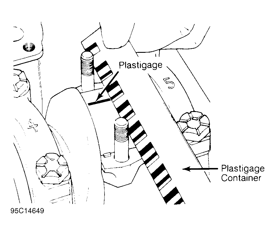 Ensure journals and bearings are free of oil or solvent. Oil or solvent will dissolve material and false reading will be obtained. Install small piece of Plastigage along full length of bearing journal. Install bearing cap in original location. Tighten bolts to specification.
