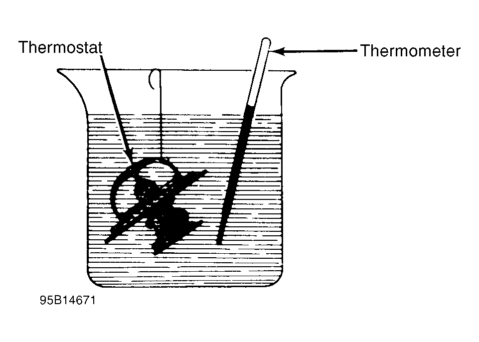- Read temperature on thermometer. This is the initial opening temperature and should be within specification. Continue heating water until thermostat is fully open and note temperature. This is the fully open temperature. If either reading is not to specification, replace thermostat.