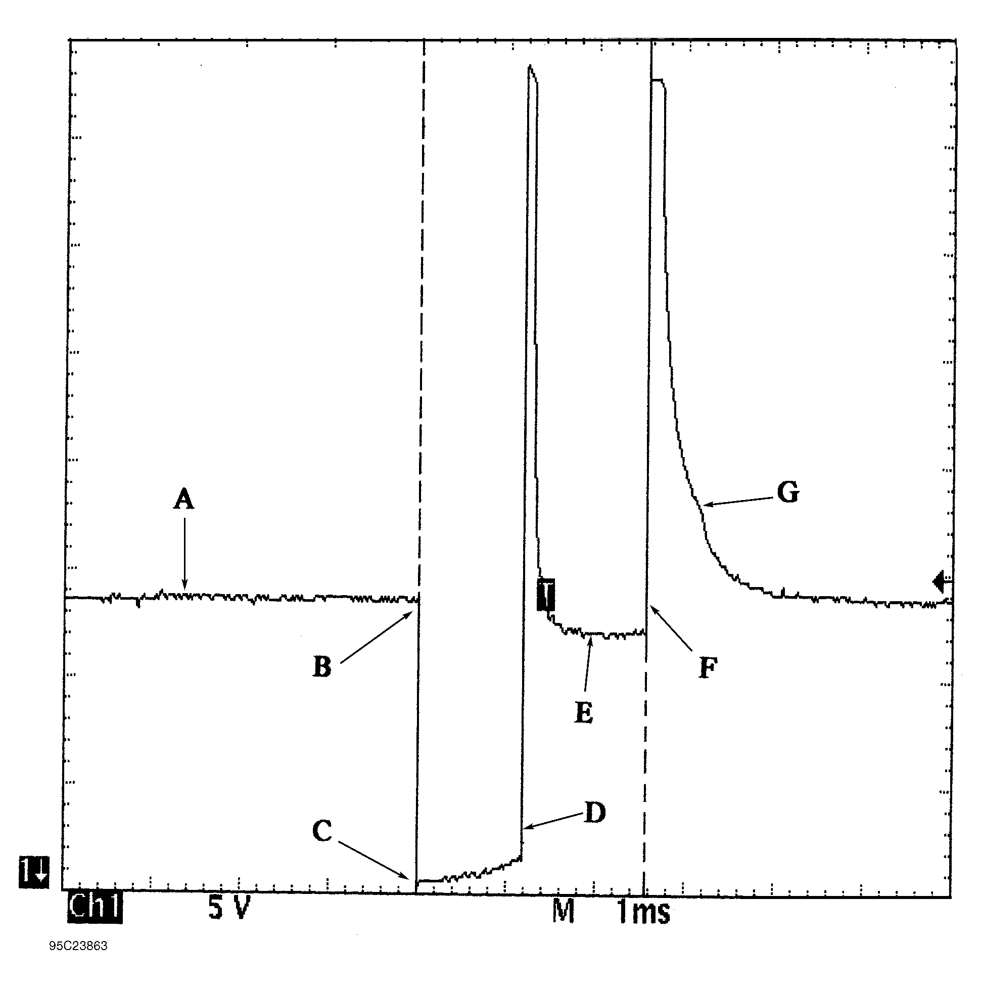 Point "G" shows a slight hump. This is actually the mechanical injector pintle closing. Recall that moving an iron core through a magnetic field will create a voltage surge. The pintle is the iron core here.