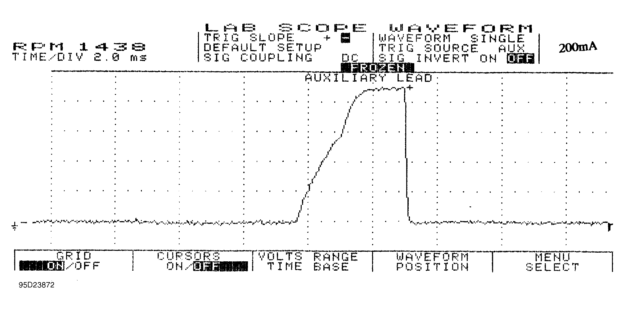Example #4 is of a Ford 4.6L SEFI VIN [W]. See Fig 1 for the known-good waveform pattern. This Ford system is different from the one above in EXAMPLE #3 as it peaks at 900 milliamps and the actual opening of the injector (set point) is just below 600 milliamps.
