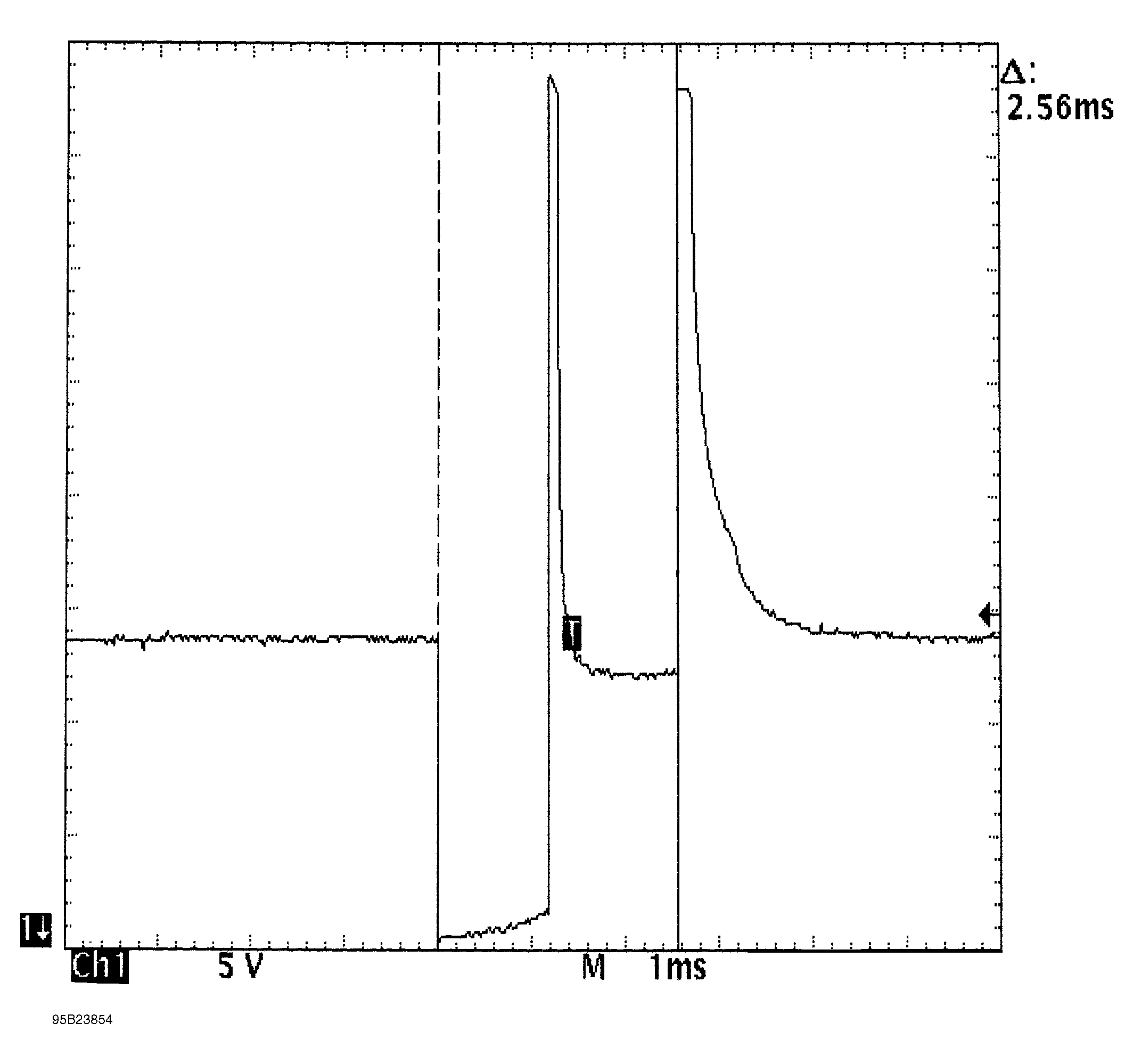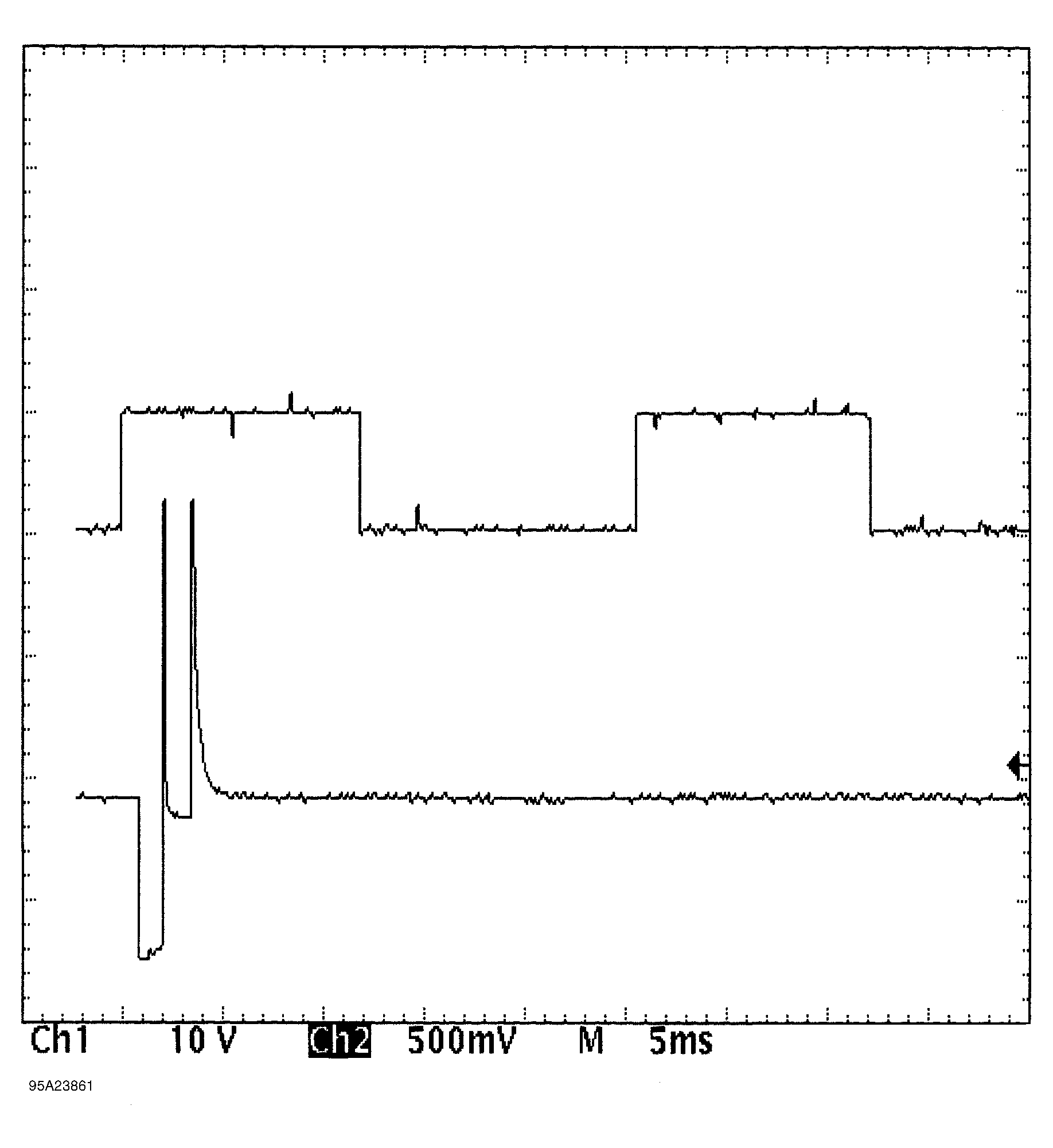 These two known-good waveform patterns are from a Chrysler 3.0L V6 VIN [3]. The first waveform, Fig. Fig 1, is a dual trace pattern that illustrates how Chrysler uses the rising edge of the engine speed signal to trigger the injectors. The second waveform, Fig. Fig 2, was taken during hot idle, closed loop, and no load.