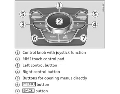 - Select the MENU button in the Infotainment system (MMI), and go to VEHICLE. See Fig 1.