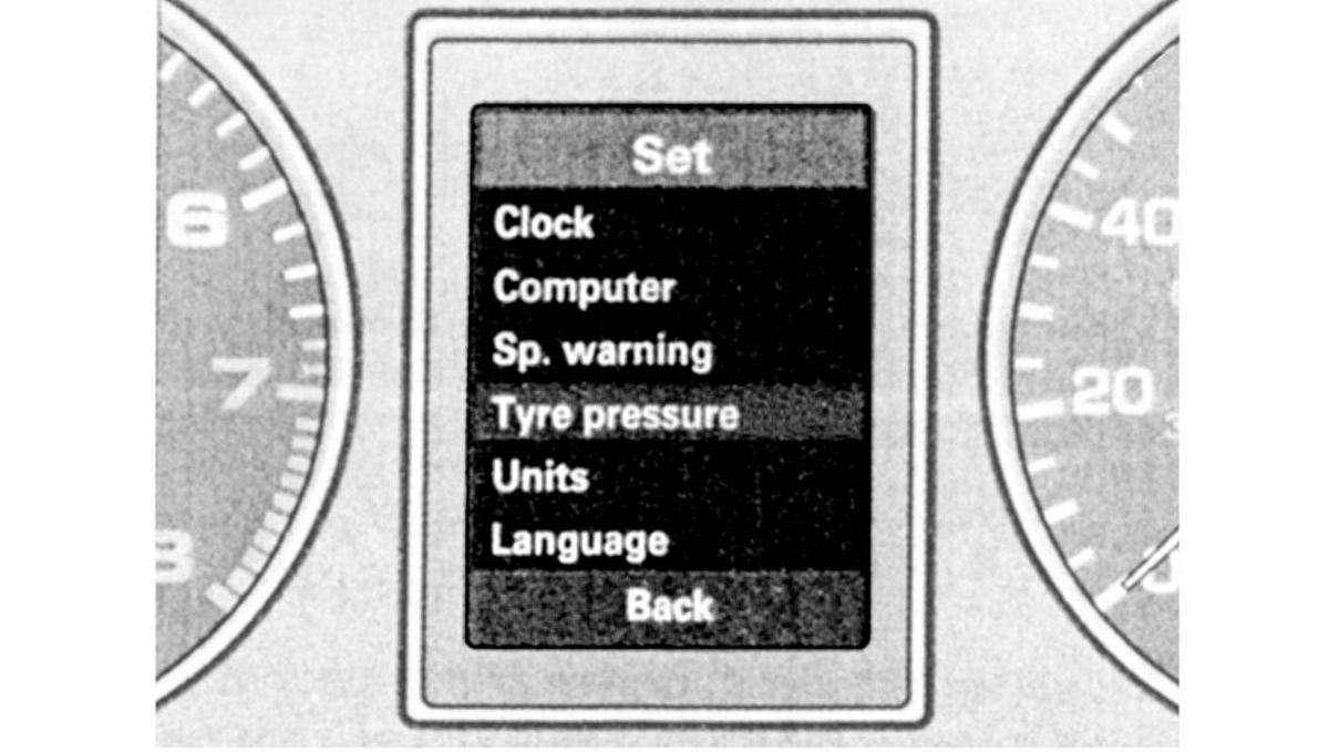 4. Turn the switch to scroll to "TYRE PRESSURE", then push switch. See Fig 3.