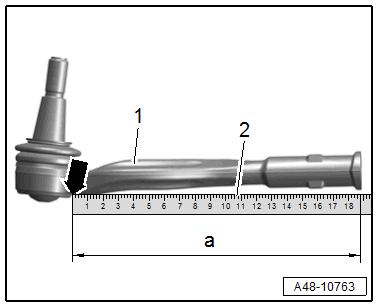 - Place a steel ruler -2- on the tie rod end and push it up to the edge of the roller -arrow- on the tie rod end -1-.