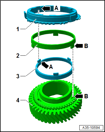 -- Lift the reverse gear synchronizer ring -6- with reverse gear assembly -5- slightly, until the anti-twist mechanism -arrow B- of the synchronization is flush with the cut-outs -arrow A- of the synchronizer hub -1-.