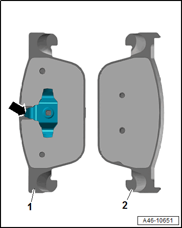 -- Insert the spring -1- into both holes -2- in the brake caliper housing.